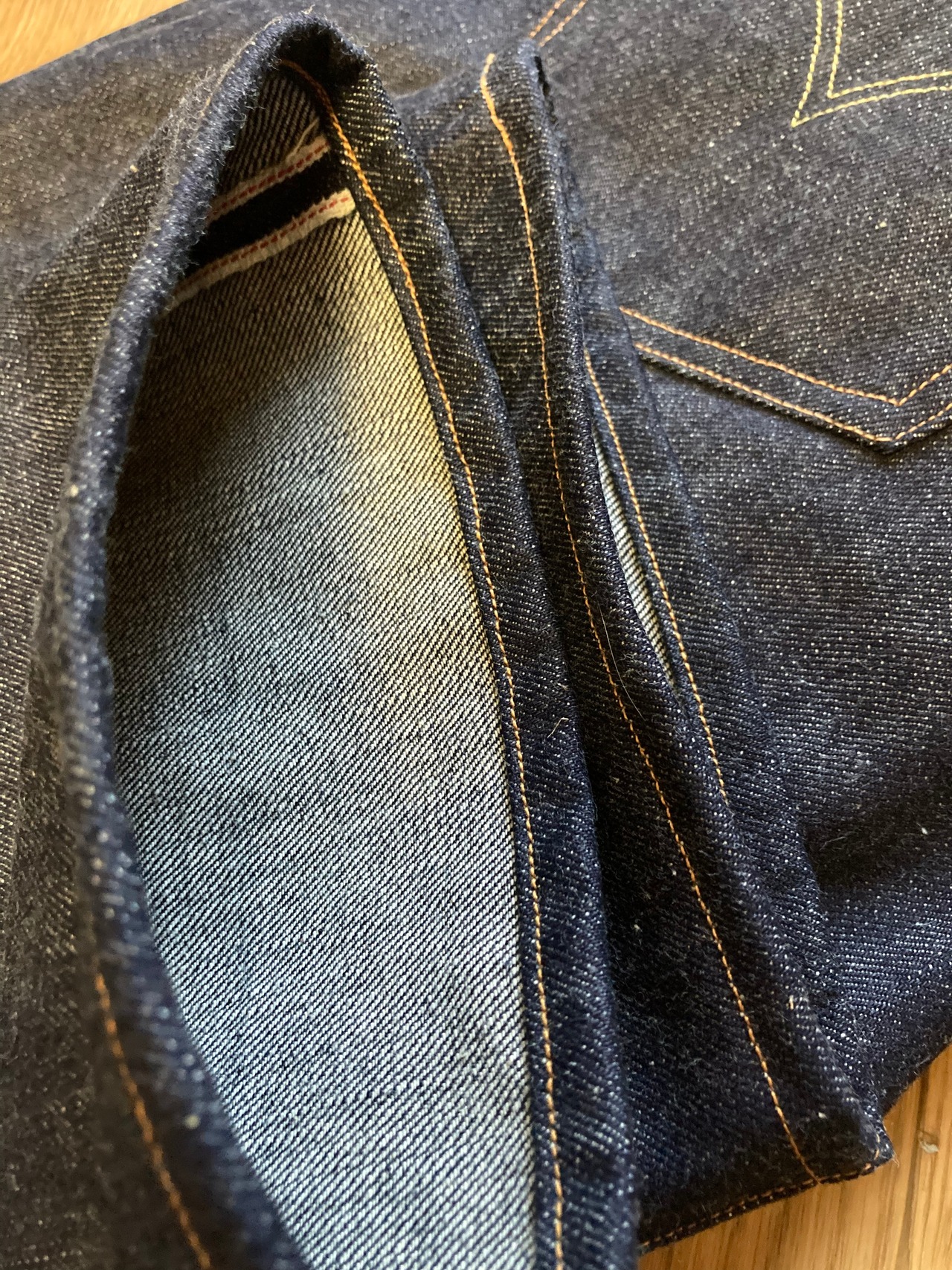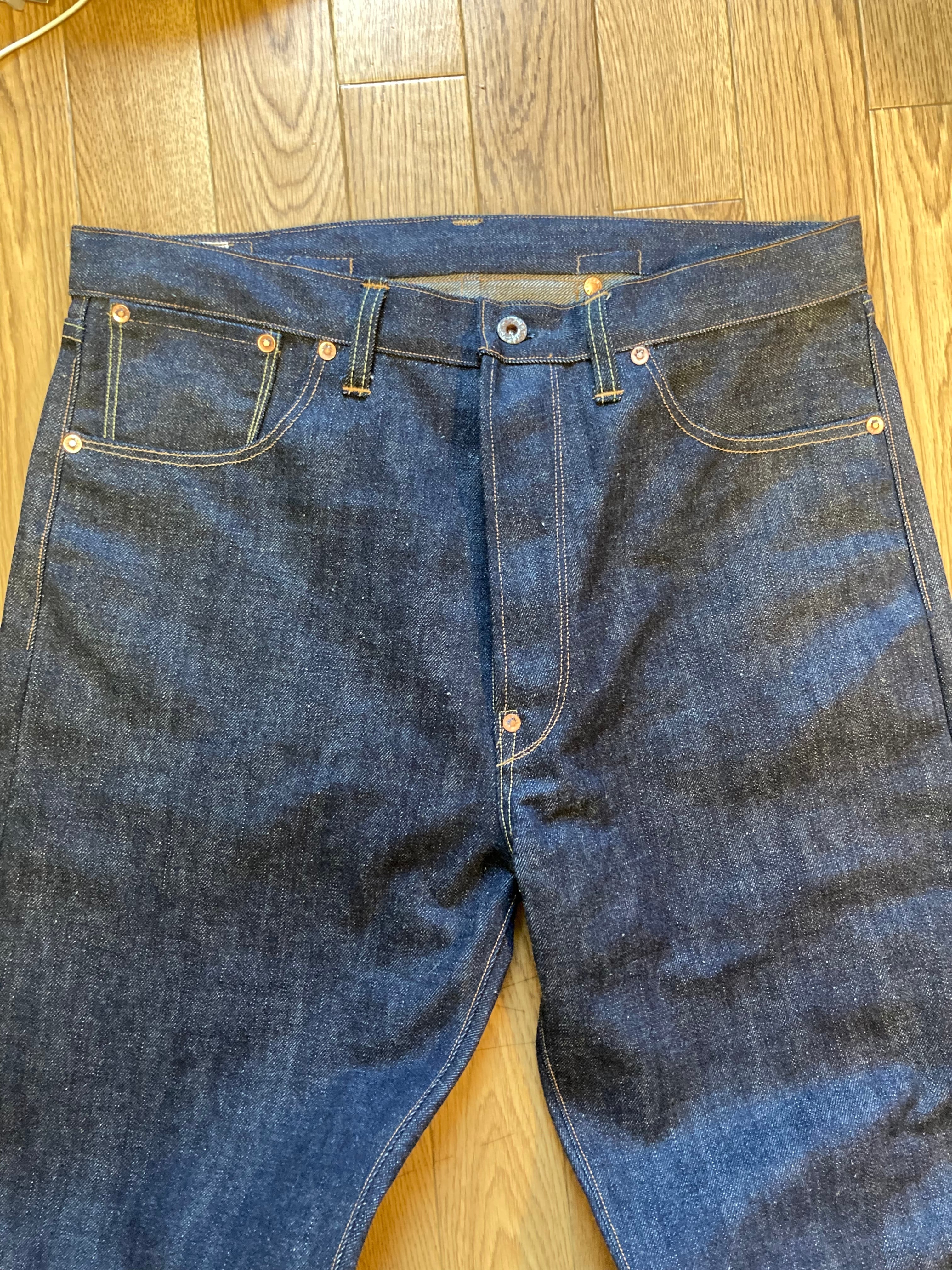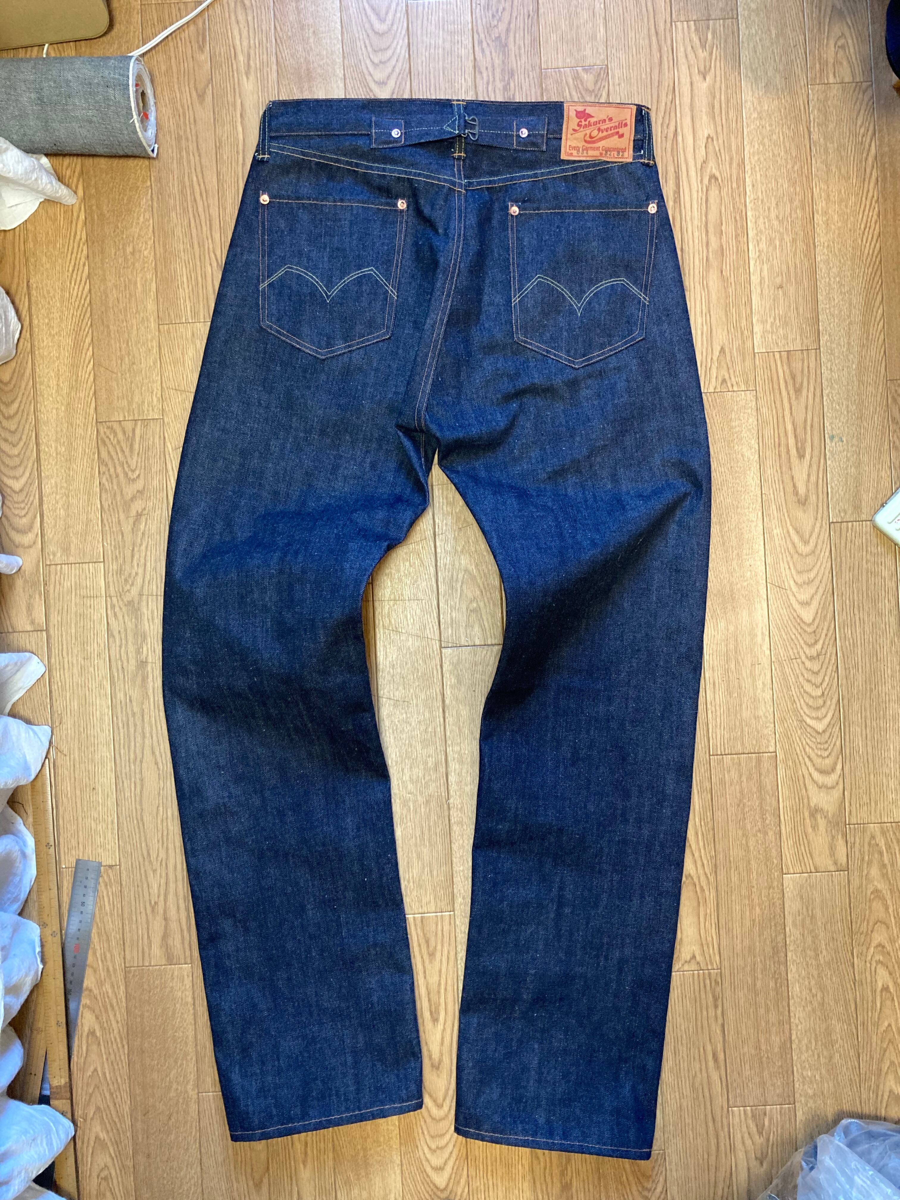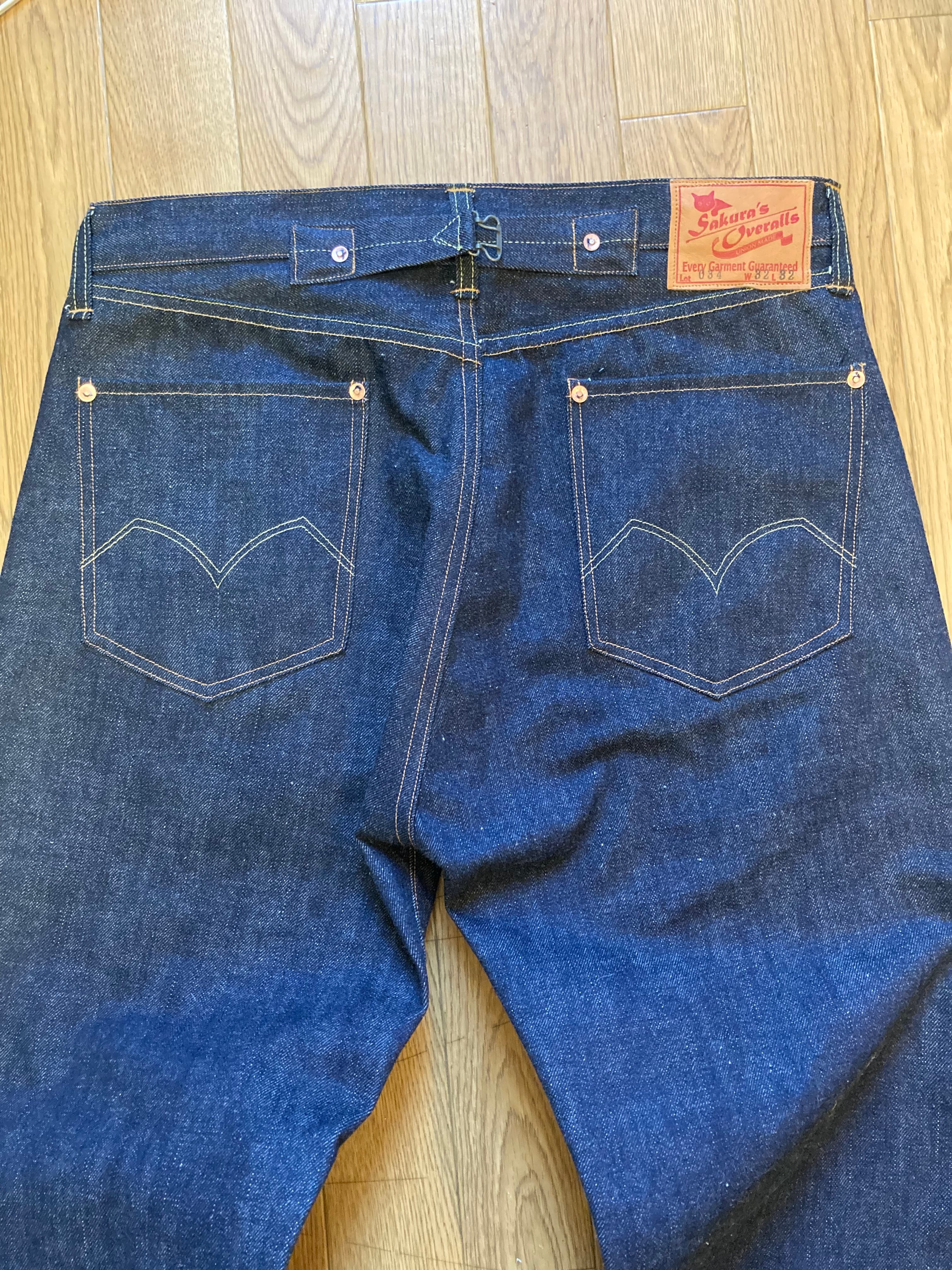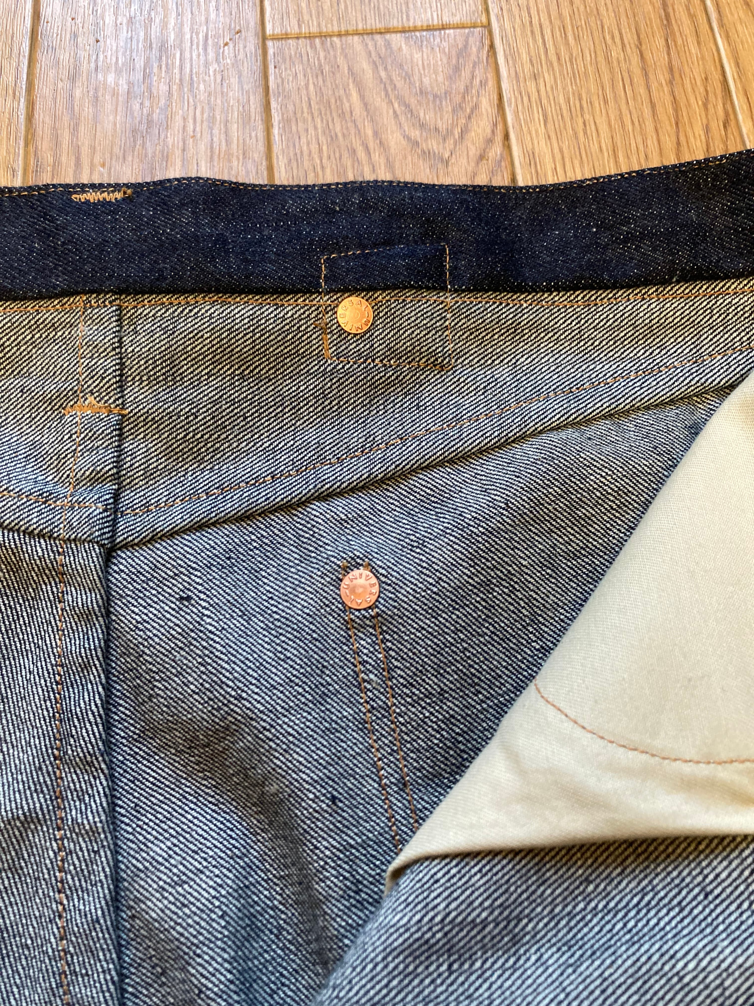 シンチベルト付き、マイクロピッチ本縫い仕様、折り伏せ縫いのバックヨーク、クロッチリベットなど当時のディティールを取り入れています。