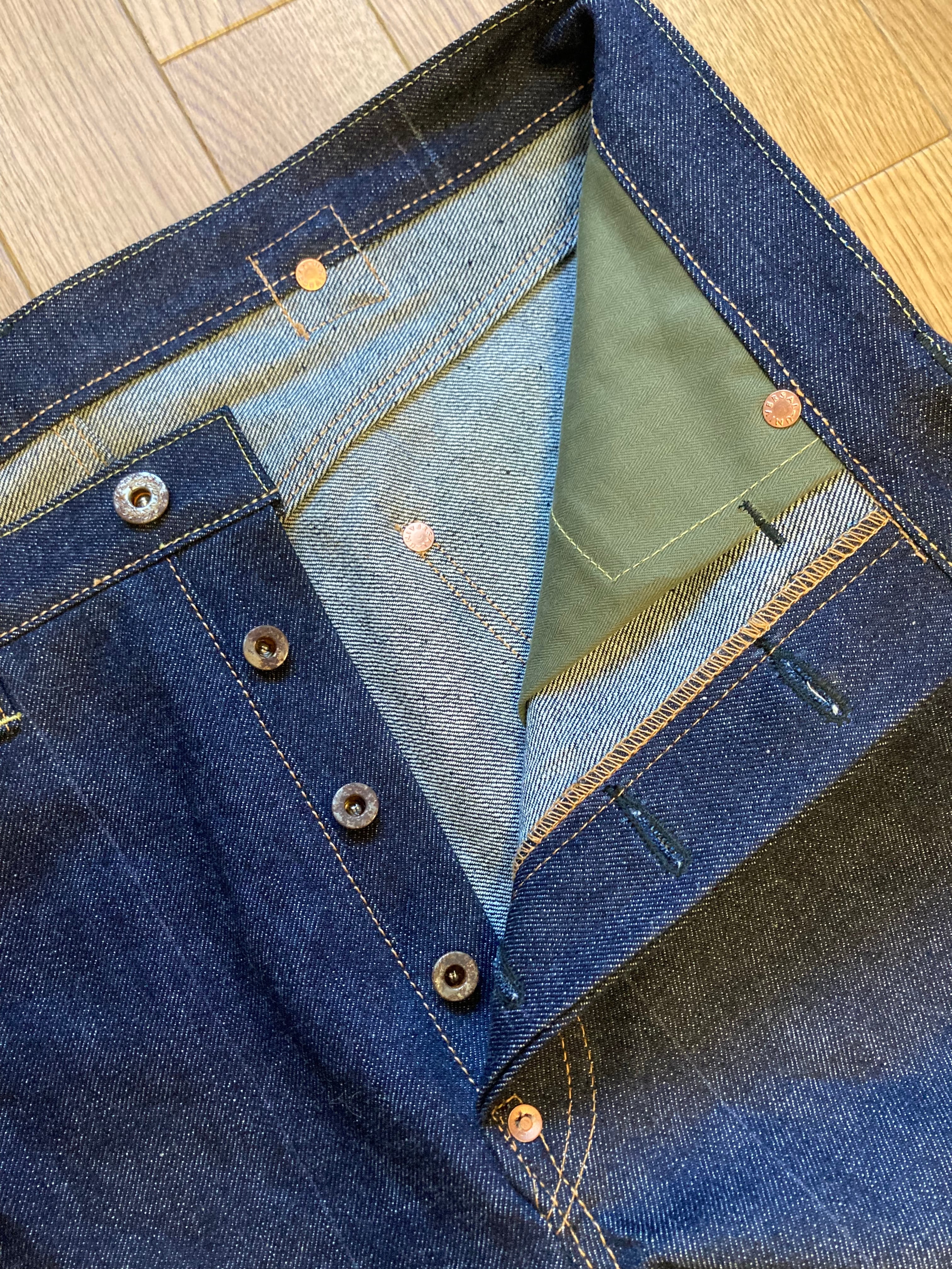 シンチベルト付き、カーキ色ヘリンボーンスレーキ、サビボタン、カッパーリベット、クロッチリベット仕様…