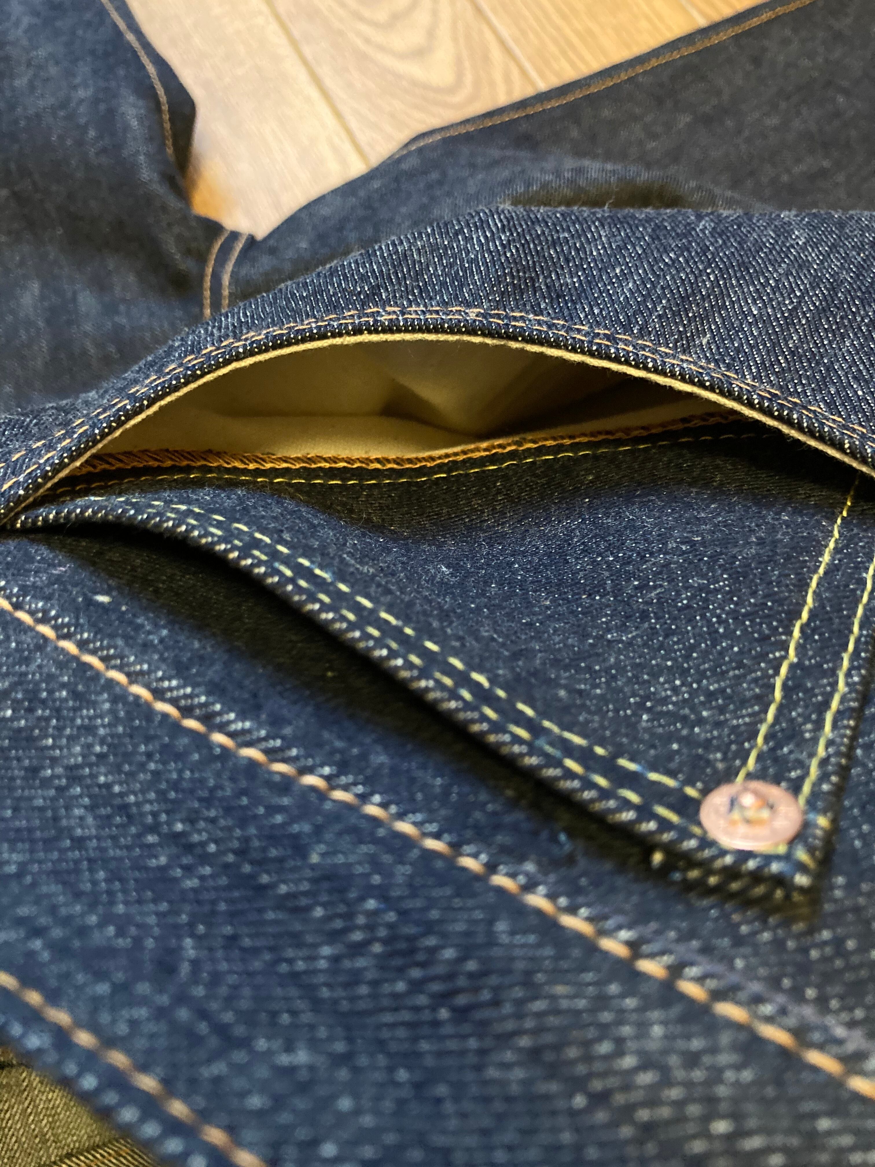 バックポケットは隠しカンドメ仕様。フラッシャーの「リベットはここにある」という英文はただの飾りとなってしまっています。