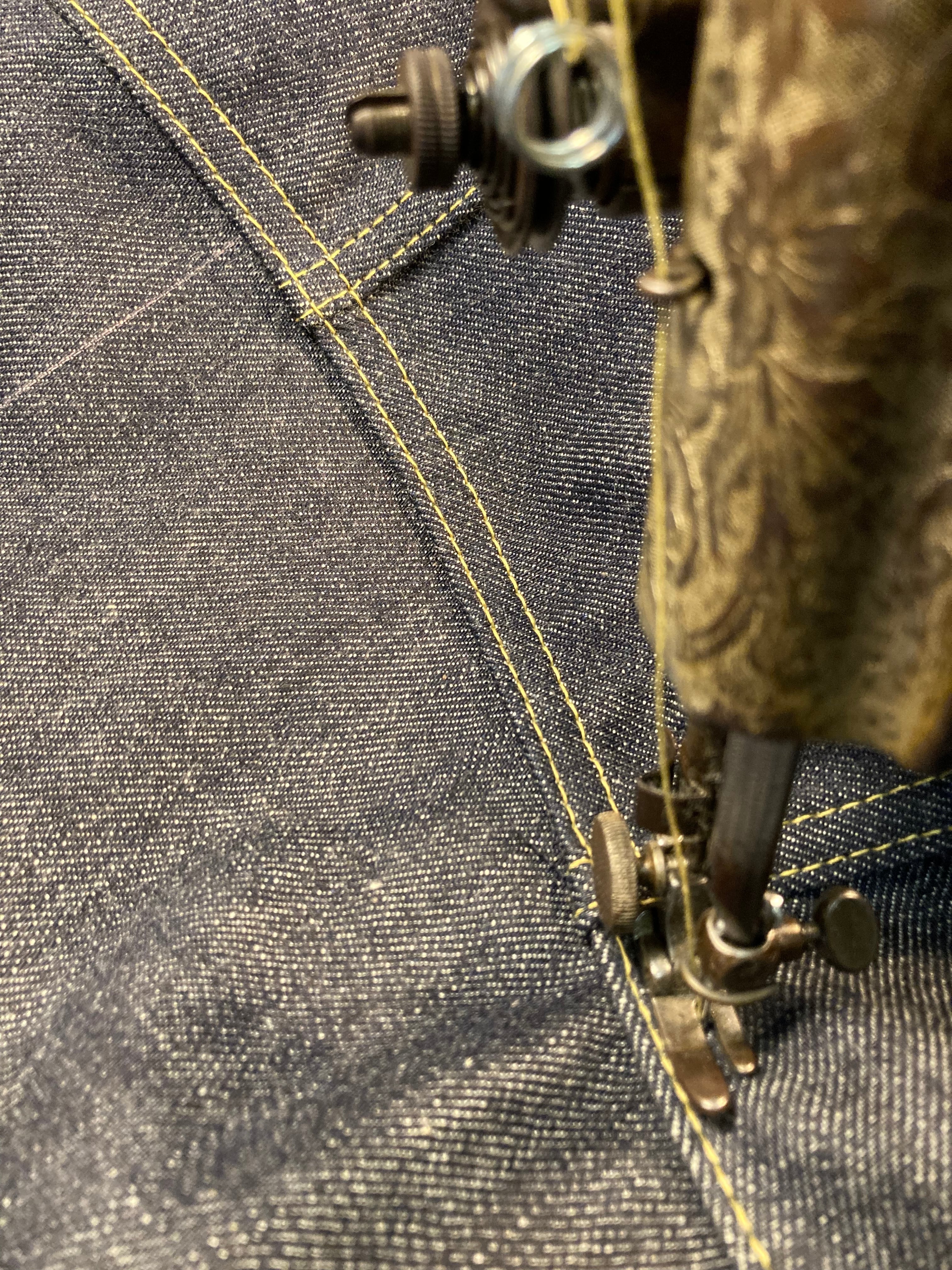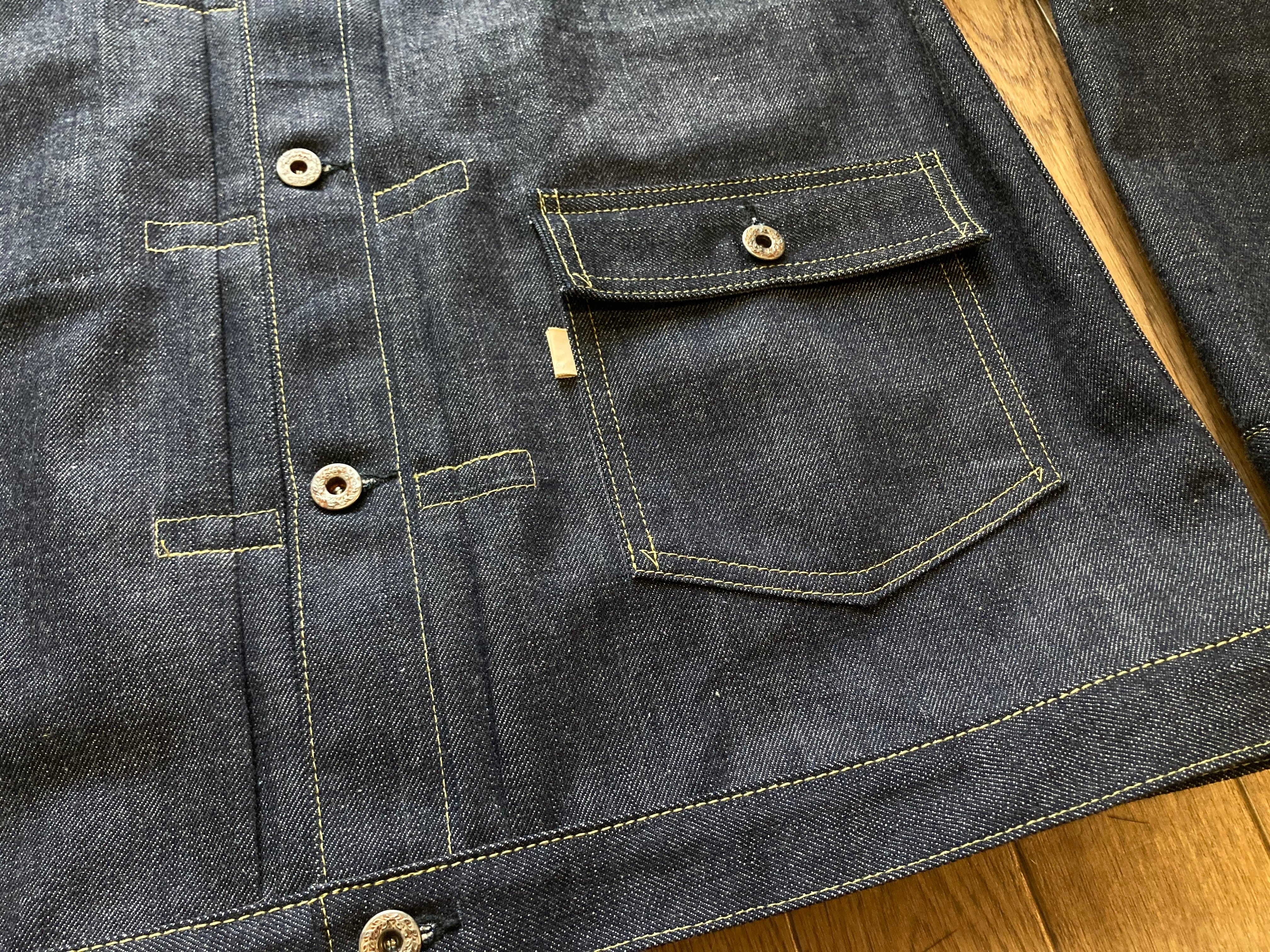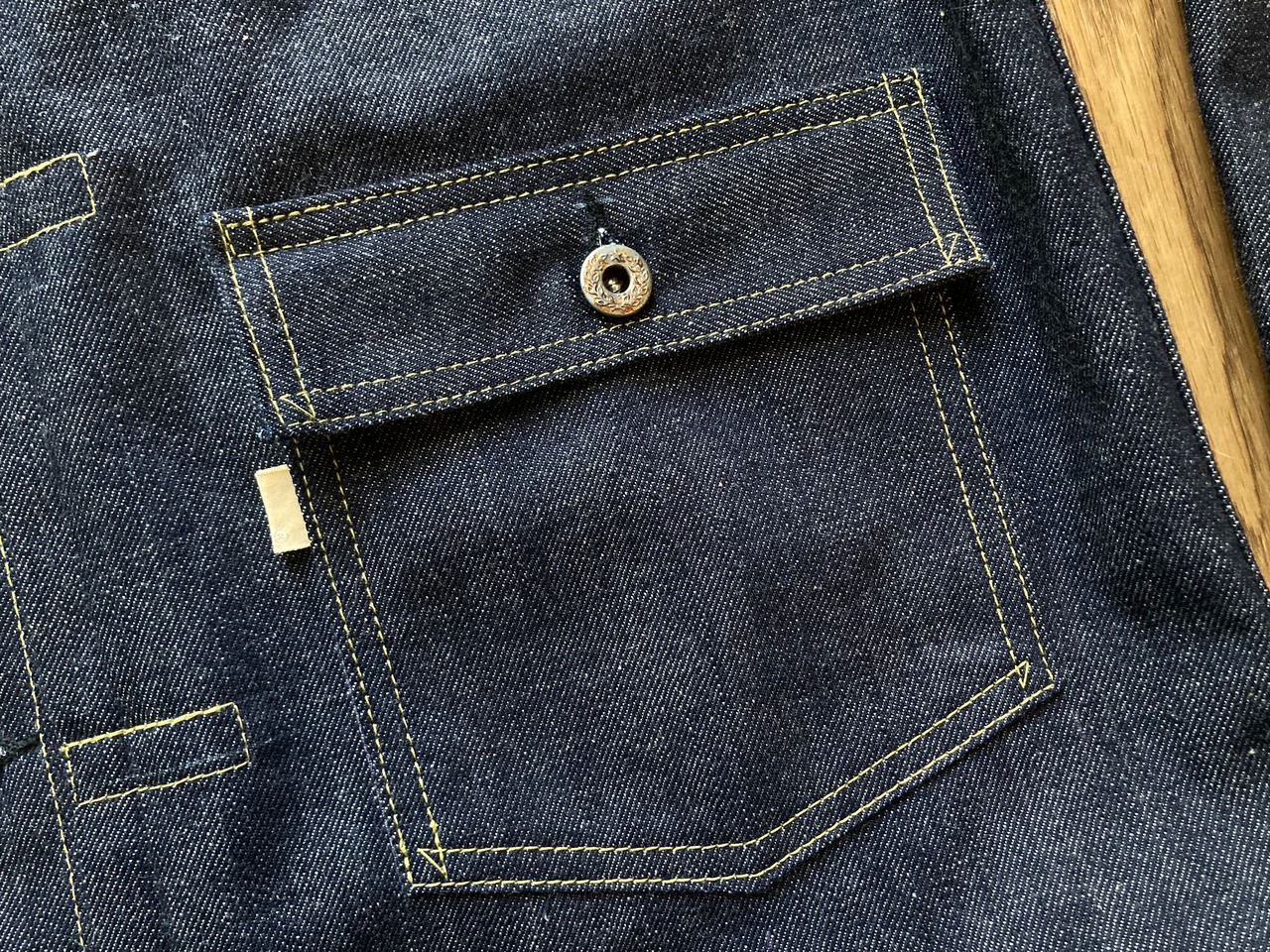 Tバック・四角いフラップポケット・無刻印銅リベット・内ポケット仕様・カフスのボタンは留めやすく逆仕様…